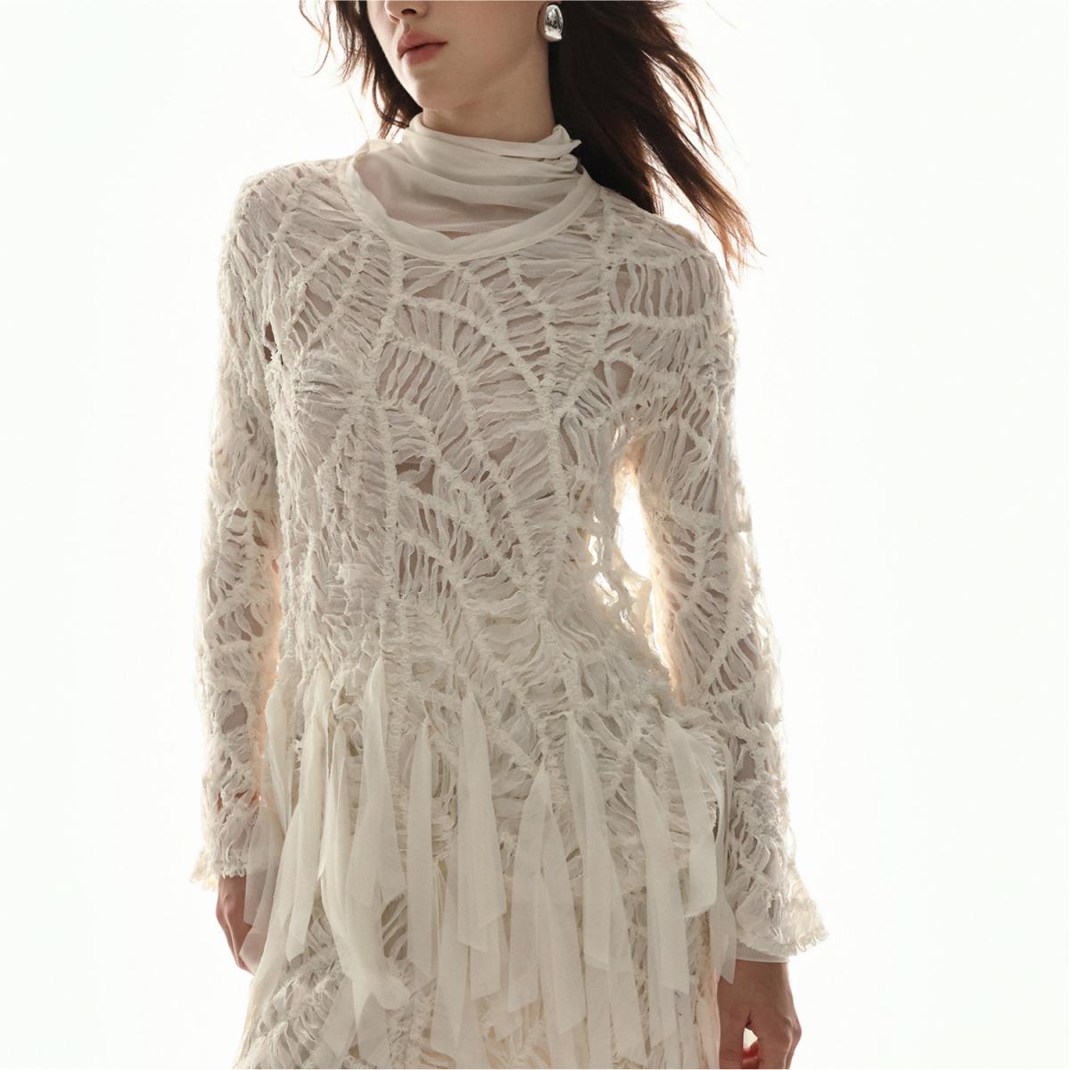 In a market flooded with puff sleeves and floral prints, this hand-textured lace and fringe design offers genuine originality. For women who value personal style, being “different” is not a trend—it is an expression of taste. This dress allows you to stand out gently, without chasing fast fashion.