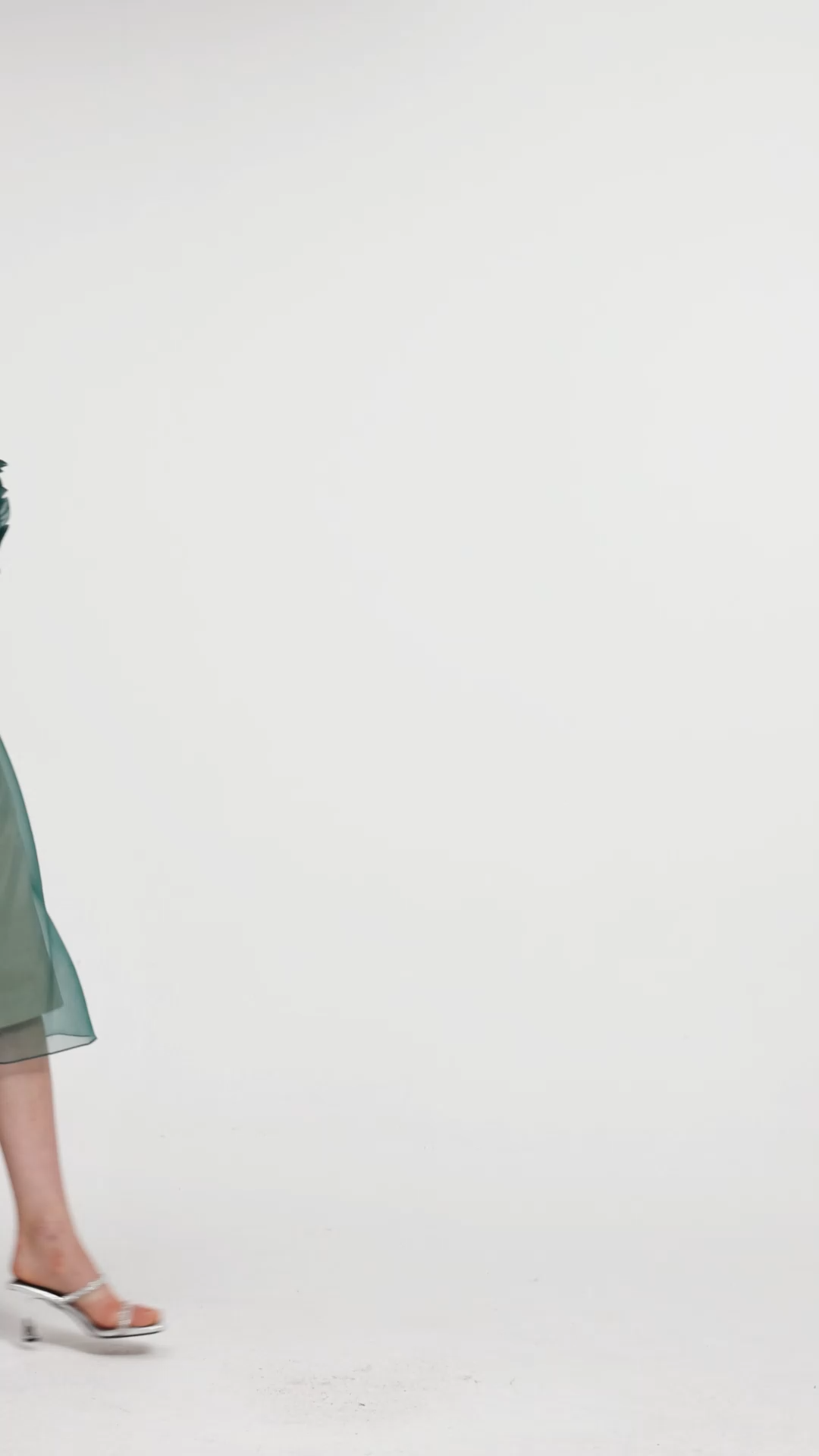 Design Details: Features a high neckline, three-quarter smocked sleeves (hand-stitched detailing), and a midi-length silhouette. Crafted from a combination of beige satin and teal organza fabrics, the dress incorporates a large, layered ruffle detail on the teal organza overlay, structured shoulder tailoring, and subtle side button accents, balancing vintage-inspired handcraft (smocking stitches) with contemporary textural contrast.Style & Occasion: Blends romantic elegance (hand-smocked sleeves, ruffle detail) with artistic sophistication (color blocking, organza fabric). Suitable for creative events, garden parties, or upscale daytime gatherings, exuding refined charm and artisanal whimsy.