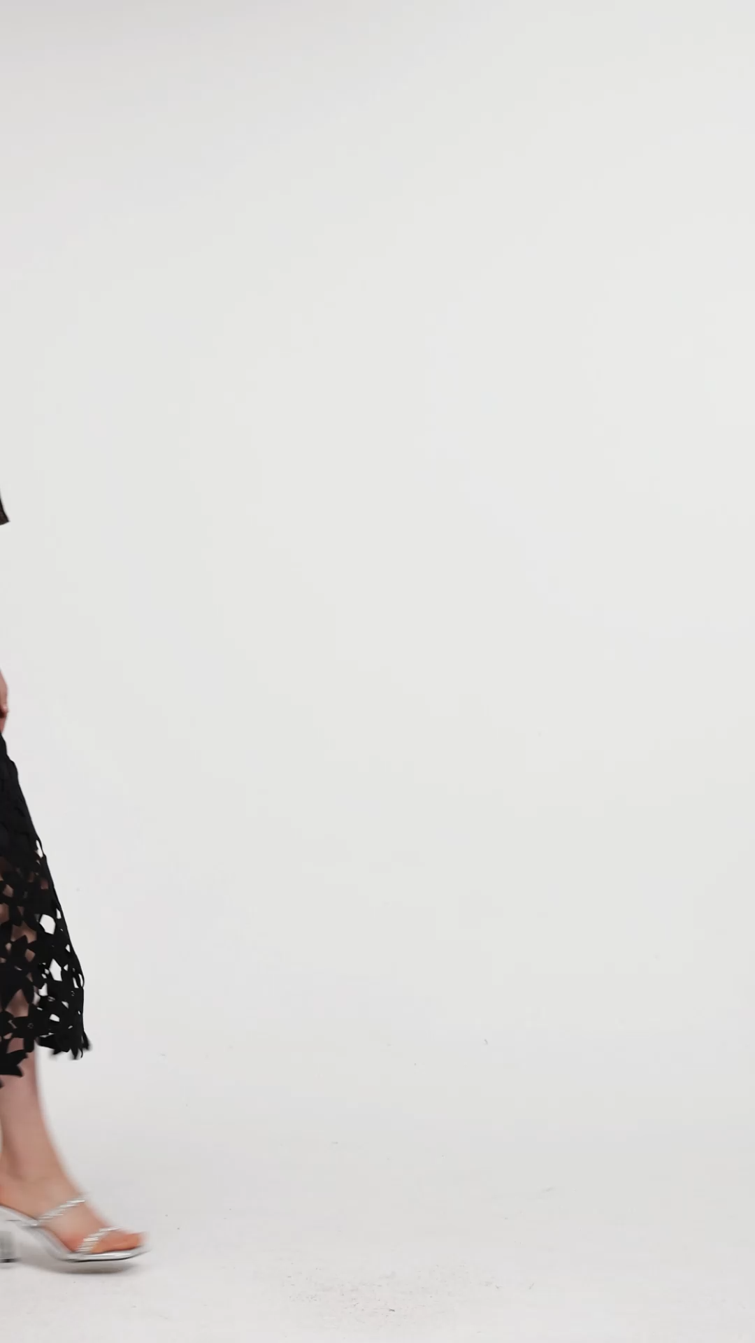 Design Details: Features a deep V-neckline, cold-shoulder cut, and cropped silhouette. Crafted from a black pleated metallic fabric with a high-shine, textured finish, the top incorporates puffed balloon sleeves with satin cuffs, a central satin button placket, and structured tailoring, balancing vintage glamour (pleated metallic texture, balloon sleeves) with contemporary edge (cold-shoulder design, cropped fit).
