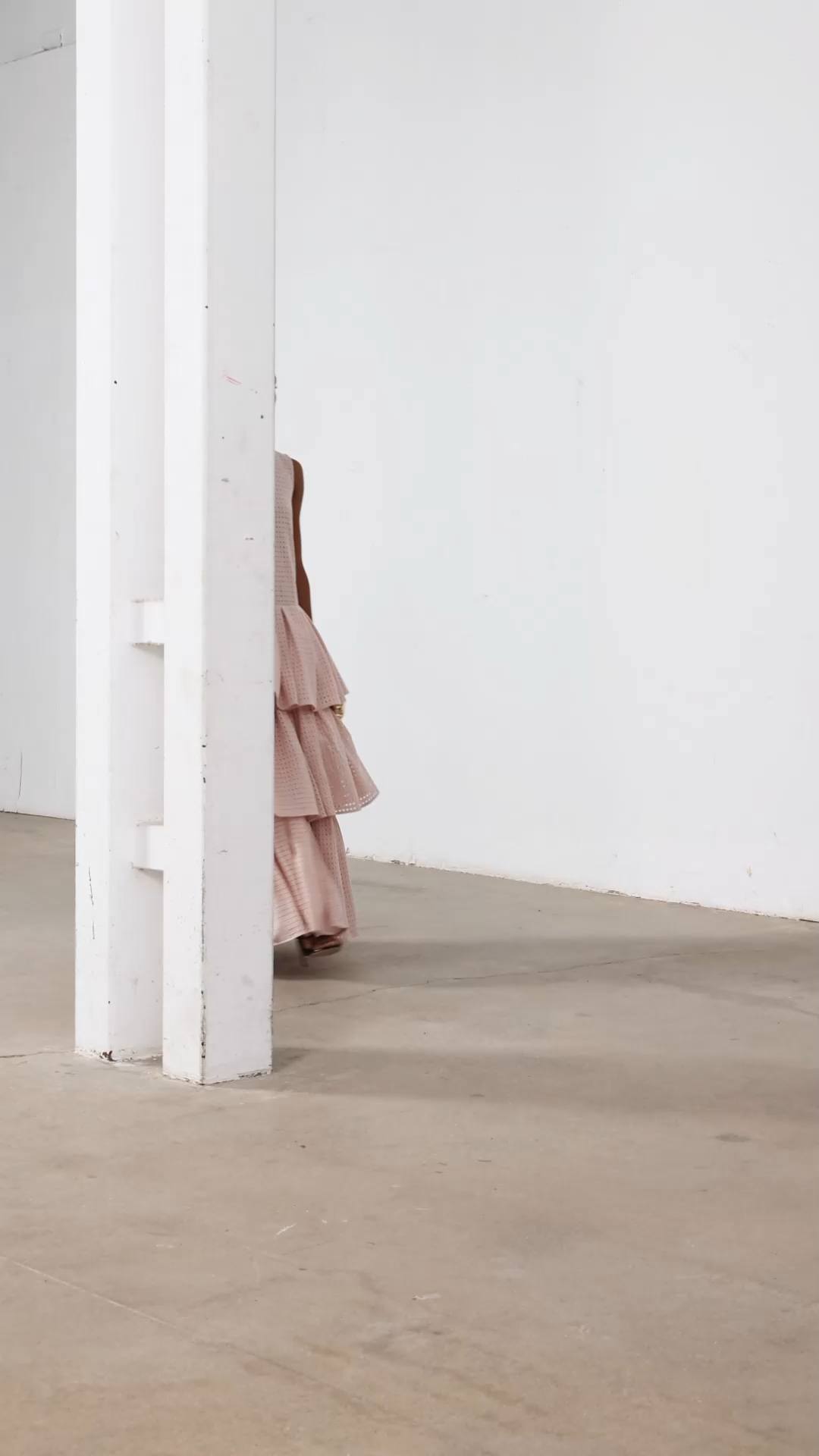 • Design Detail:This is a floor-length gown in a soft blush pink hue, crafted from a textured, open-grid lace fabric that adds subtle depth and visual interest. It features a sleeveless high-neck bodice with a structured, minimalist silhouette, which contrasts dramatically with the voluminous, multi-tiered ruffle skirt. The skirt is composed of three cascading tiers that create a playful, sculptural silhouette, balancing the clean lines of the bodice with romantic, movement-rich volume.