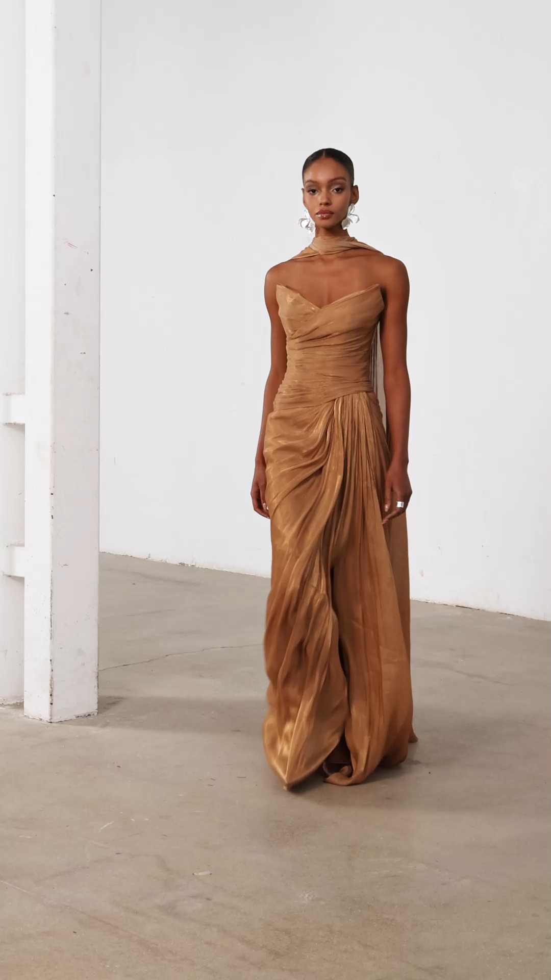 • Design Detail:This is a floor-length gown in a rich, metallic bronze hue, crafted from a lustrous, ruched satin fabric that catches light for a subtle sheen. The body-skimming bodice has dramatic side ruching that leads into a sweeping train, creating a sculptural, red-carpet-ready silhouette. The lightweight, fluid fabric drapes elegantly, balancing the bold metallic hue with a textured, modern finish.