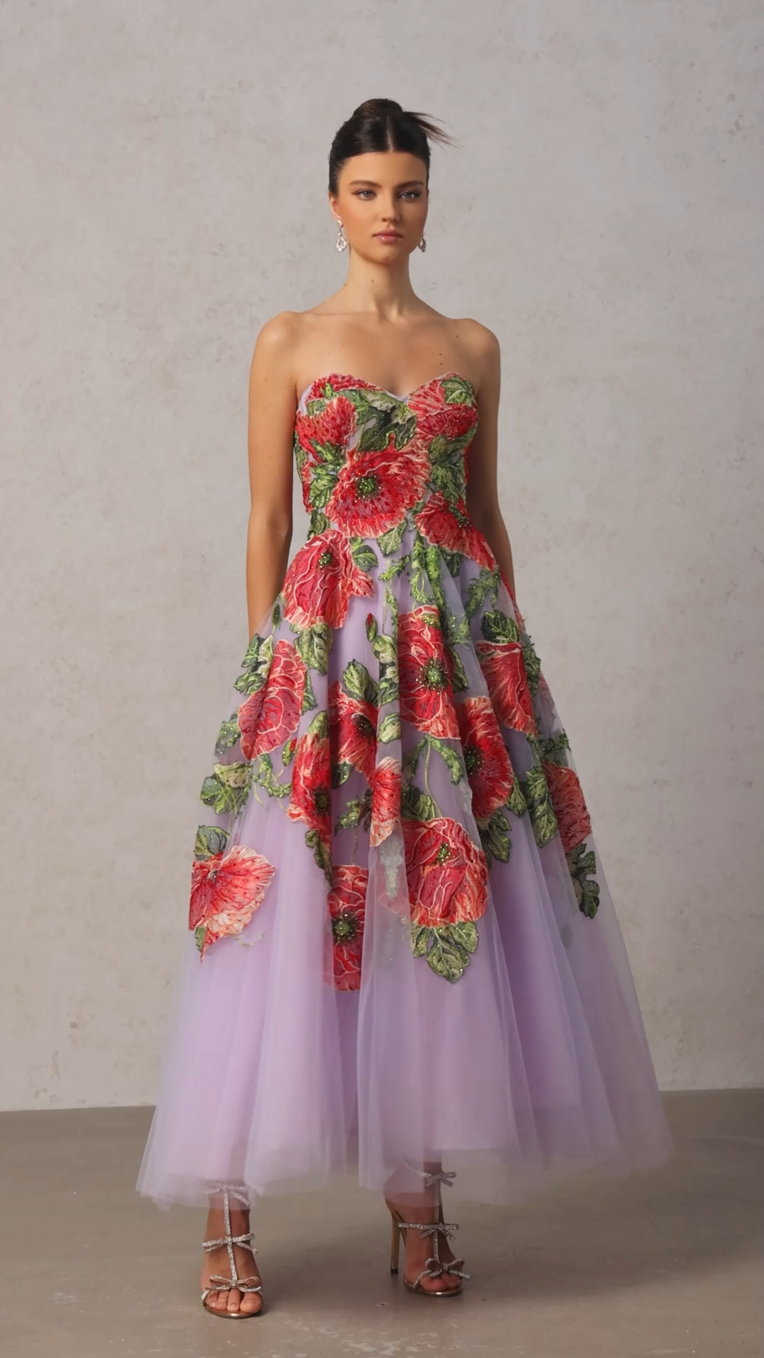 This gown is a masterpiece where art and ingenuity blend, fully demonstrating the diverse charm of women. The skirt is made of light and airy tulle fabric, draping lightly like a dreamy purple mist, injecting an ethereal and elegant temperament into the whole, which is exactly the poetic pursuit of freedom and romance by urban white-collar workers in the fast-paced life. The carefully presented embroidered flowers, with vivid colors and delicate stitches, bloom with vigorous vitality, as if freezing the beauty and enthusiasm of the spring garden on the skirt, allowing the wearer to exude their own unique elegance and vivid power on any occasion.