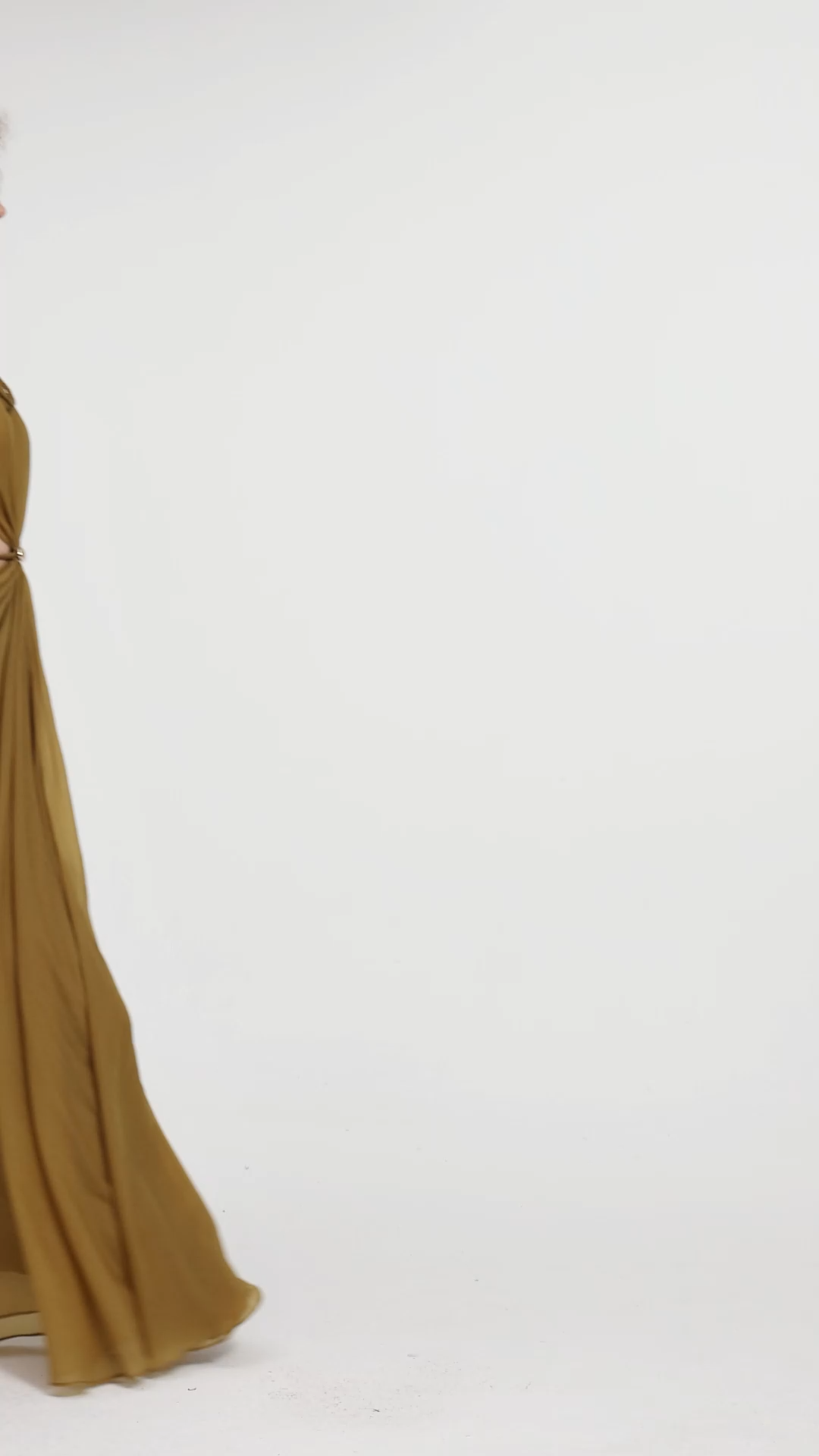 Design Details: Features a high neckline adorned with three ponytail-inspired braided details, creating a unique textural and dimensional look. The dress has a waist cut-out detail accented with a metal buckle, enhancing its design appeal. Made from chiffon fabric, it offers both drape and airiness, with a maxi-length silhouette.