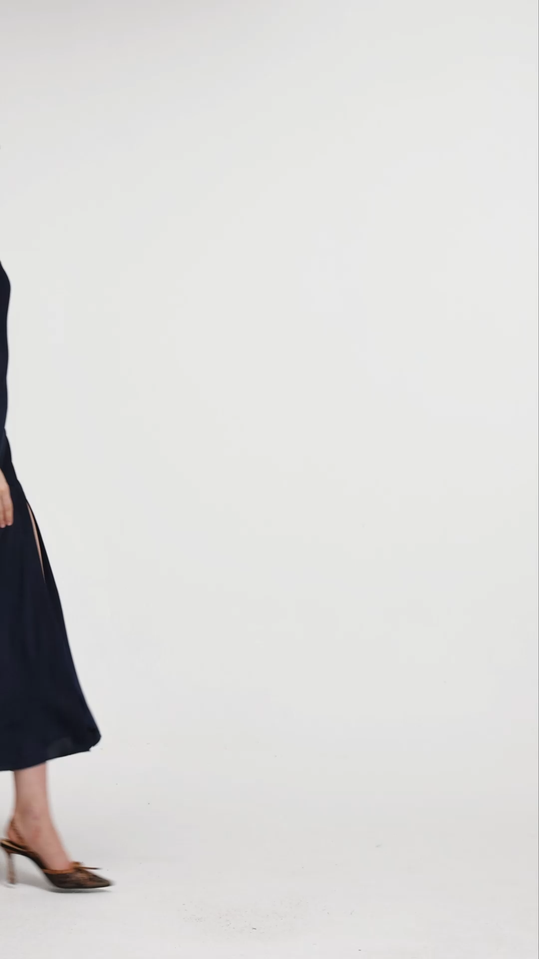 Design Details: Features a high cowl neckline, sleeveless cut, and a midi-length silhouette with a side slit. Crafted from a navy satin fabric with a smooth, lustrous finish, the dress combines a tailored bodice with a fluid, asymmetric skirt, offering a balance of structure and elegance.Style & Occasion: Blends timeless sophistication (satin fabric, cowl neck) with modern allure (side slit, midi length). Suitable for formal events, evening receptions, or upscale social gatherings, exuding refined charm and contemporary elegance.
